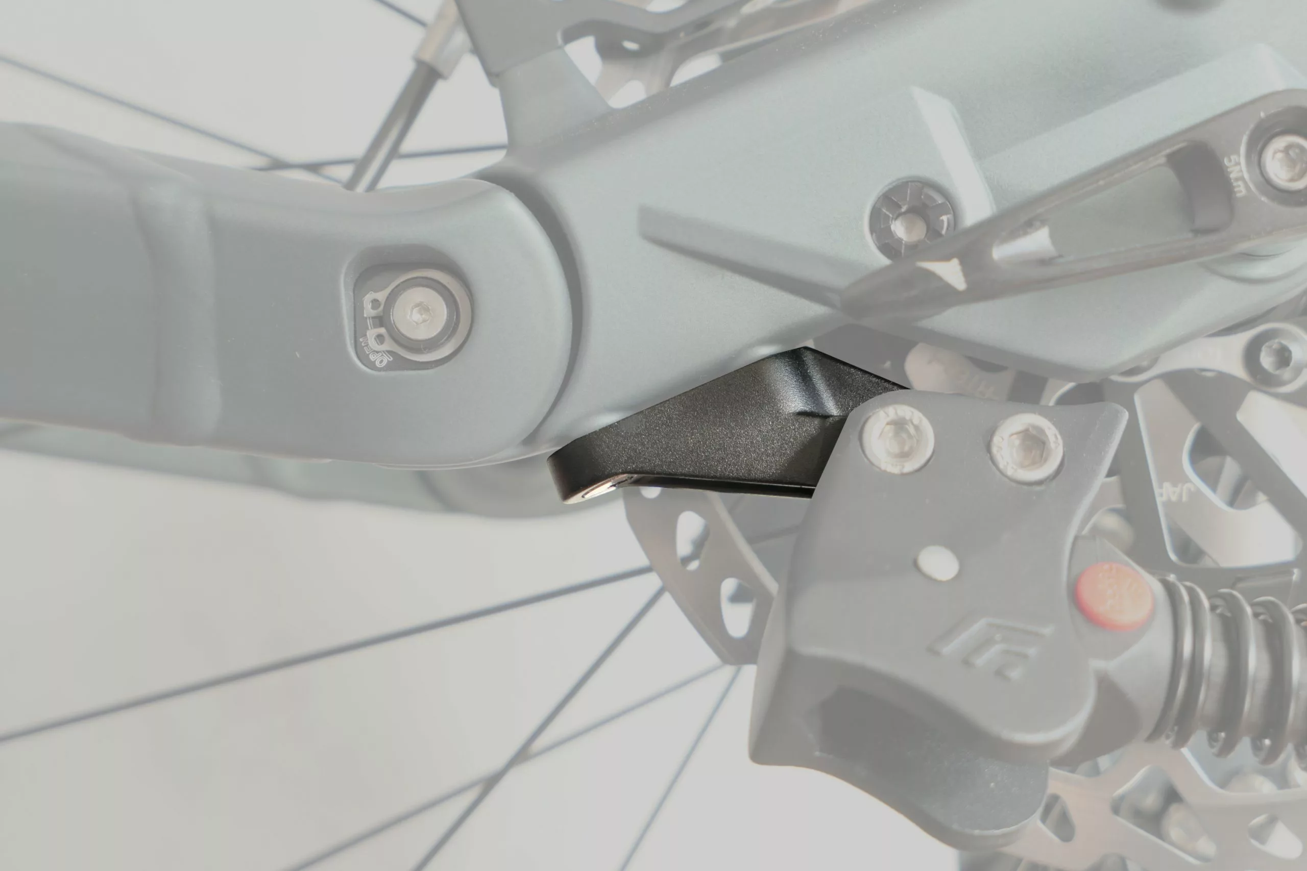Die Halteplatte wird an der Kettenstrebe-Aufnahmeplatte befestigt, woran der Ständer mit Direktbefestigung und einem 18 mm Lochabstand, montiert wird. Die Rahmenaufnahme hat einen Lochabstand von ca. 25mm (Lochmitte-Lochmitte).