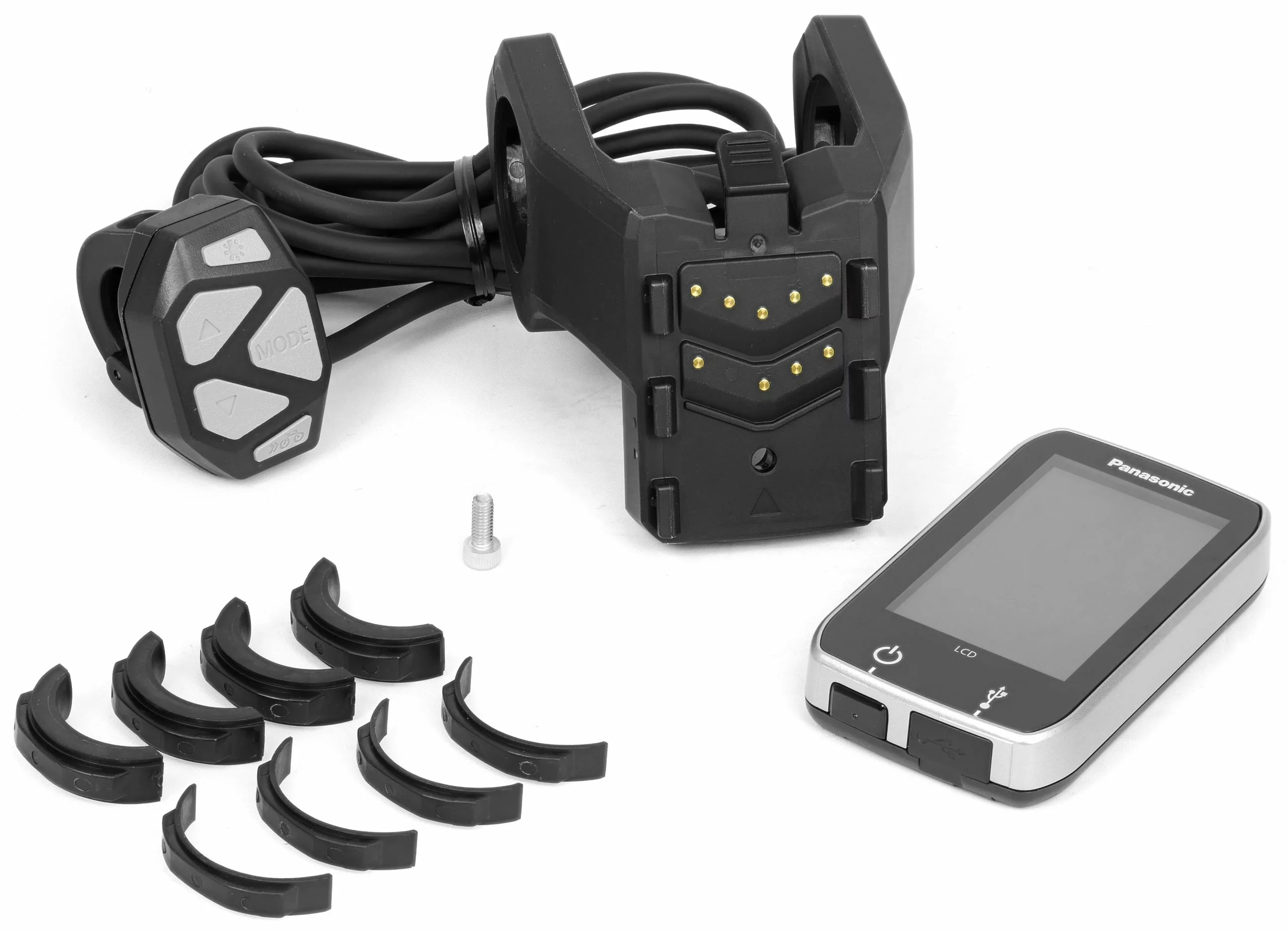| Lieferumfang: | 1x Panasonic LCD Display, 1x Bedieneinheit, 1x Zentral-Halterung inkl. Anschlusskabel, 8x Distanz-Gummis für versch. Lenkerklemmungen, 1x Sicherungsschraube für Display |