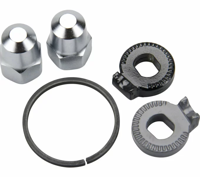 SHIMANO Kleinteile Set für die Alfine DI2 Getriebenaben für verschiedene Ausfallenden. Das Set umfasst zwei Hutmuttern, zwei Unterlegscheiben (Verdrehsicherungen) und einen Distanzring.
