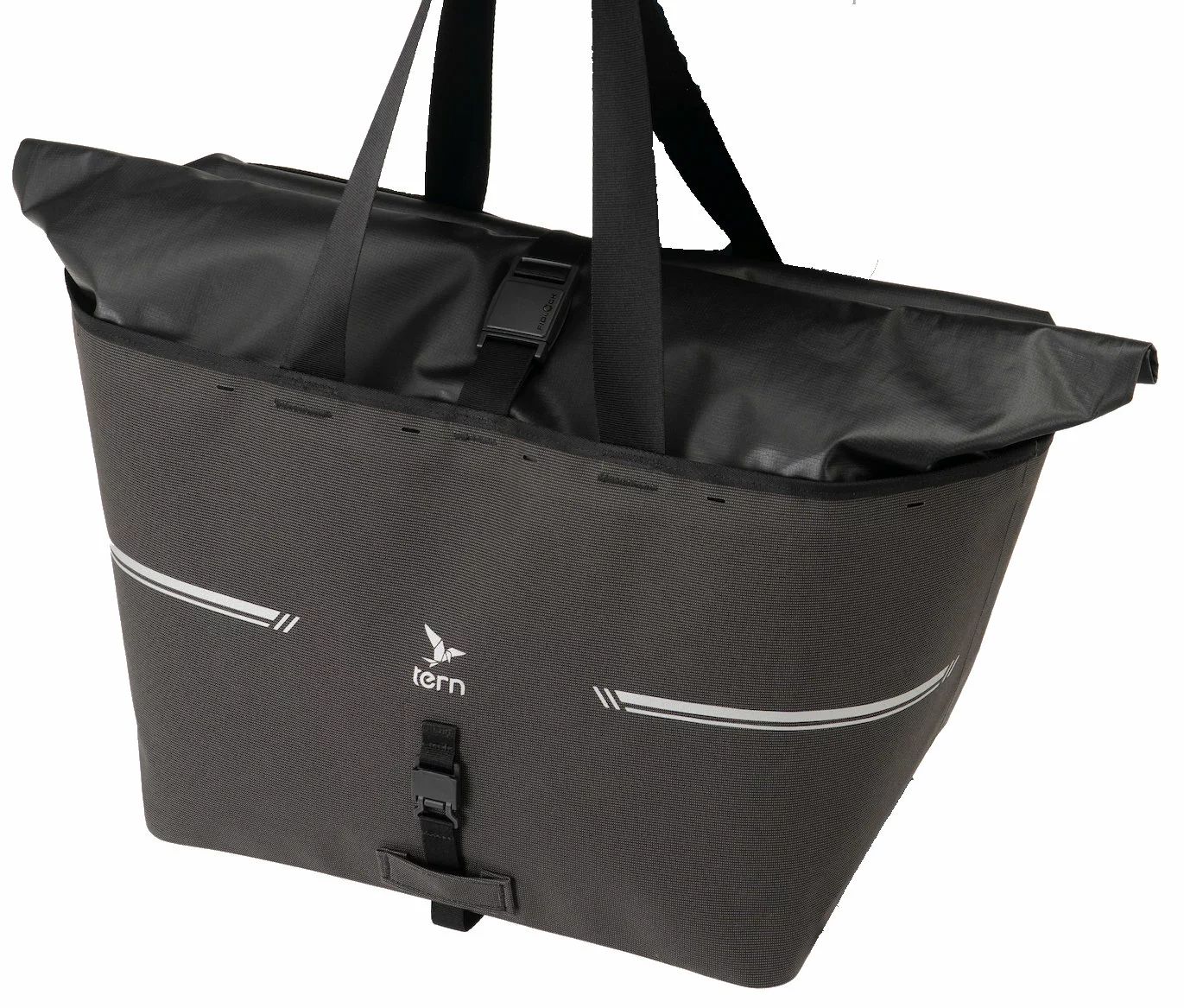 Die Tern WeatherTop Bag ist eine wasserdichte Transporttasche, welche die Transportkapazität des vorderen Gepäckträgers erheblich erhöht. Dank 45 Liter Fassungsvolumen, bietet die WeatherTop Bag genügend Platz für den Wochenendeinkauf oder um alles mitzunehmen, was für einen Familien Ausflug benötigt wird. Die Tasche besteht aus strapazierfähigem und wasserdichtem Material, welches teilweise aus recycelten PET hergestellt wurde. Zudem sind die Nähte ultraschall-verschweißt, sodass auch sehr schwere Lasten mit der Tasche transportiert werden können. Die für Transporteur und Hauler Rack konzipierte Tasche, wird mittels Fidlock Magnetschnallen sowie Riemen am Frontgepäckträger sicher fixiert. Das Weitern kann die WeatherTop Bag mittels Rollverschluss verschlossen werden, damit der Inhalt komplett vor äußeren Einflüssen geschützt ist. Im offenen „Bucket-Modus“ ist die Tasche leicht zugänglich, wie ein großer Eimer, wodurch große Sachen einfach eingeladen werden können. Durch die äußerst bequemen Trageriemen, ist die WeatherTop Bag auch abseits des Fahrrades ein idealer Begleiter bei Einkäufen oder dem Gang zum Strand.